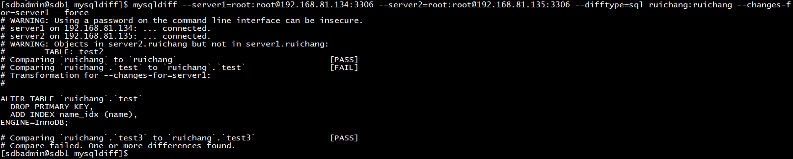 mysqldiff --server1=root:root@192.168.81.134:3306 --server2=root:root@192.168.81.135:3306 --difftype=sql ruichang:ruichang --changes-for=server1 --force
