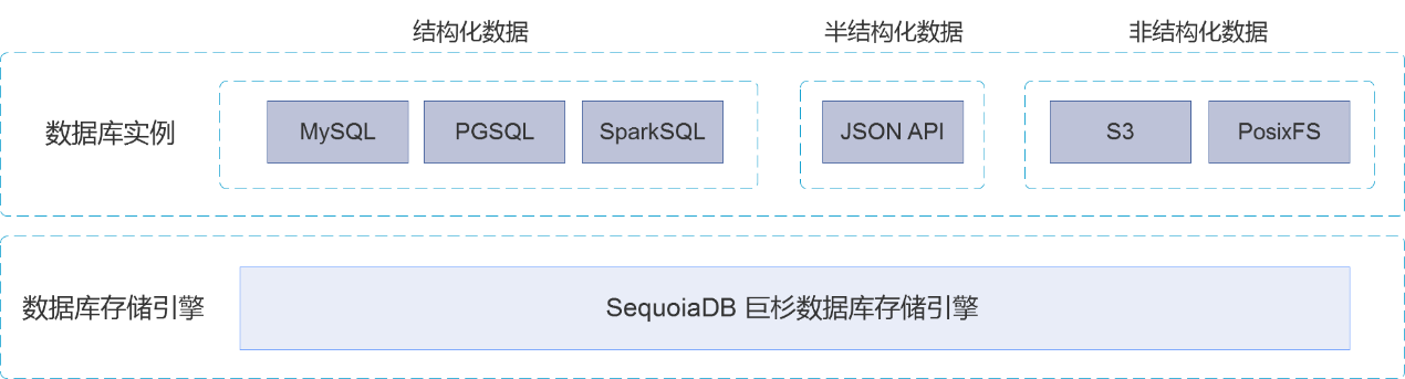 SequoiaDB数据库总体分为实例层和SequoiaDB分布式存储引擎层等两层。和MySQL数据库相比,它使用SequoiaDB分布式存储引擎替代InnoDB。