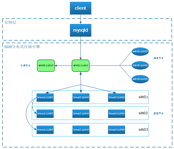 · 协调节点承接着与MySQL实例层、编目节点、数据节点的交互。